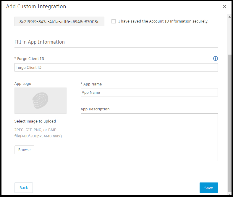 - In the final dialog, check the box on the top right I have Saved the Account ID Information Safely, copy and paste the Manufacton Forge ID into the Forge Client ID text box and provide Manufacton Web App or Manufacton Plugin as the name for the integration depending on which one is being setup. Once complete, click the blue Save button. If you are using both the AutoCAD Plugin and the Web App, you will need to complete this process once for each tool using the unique Forge ID from both.